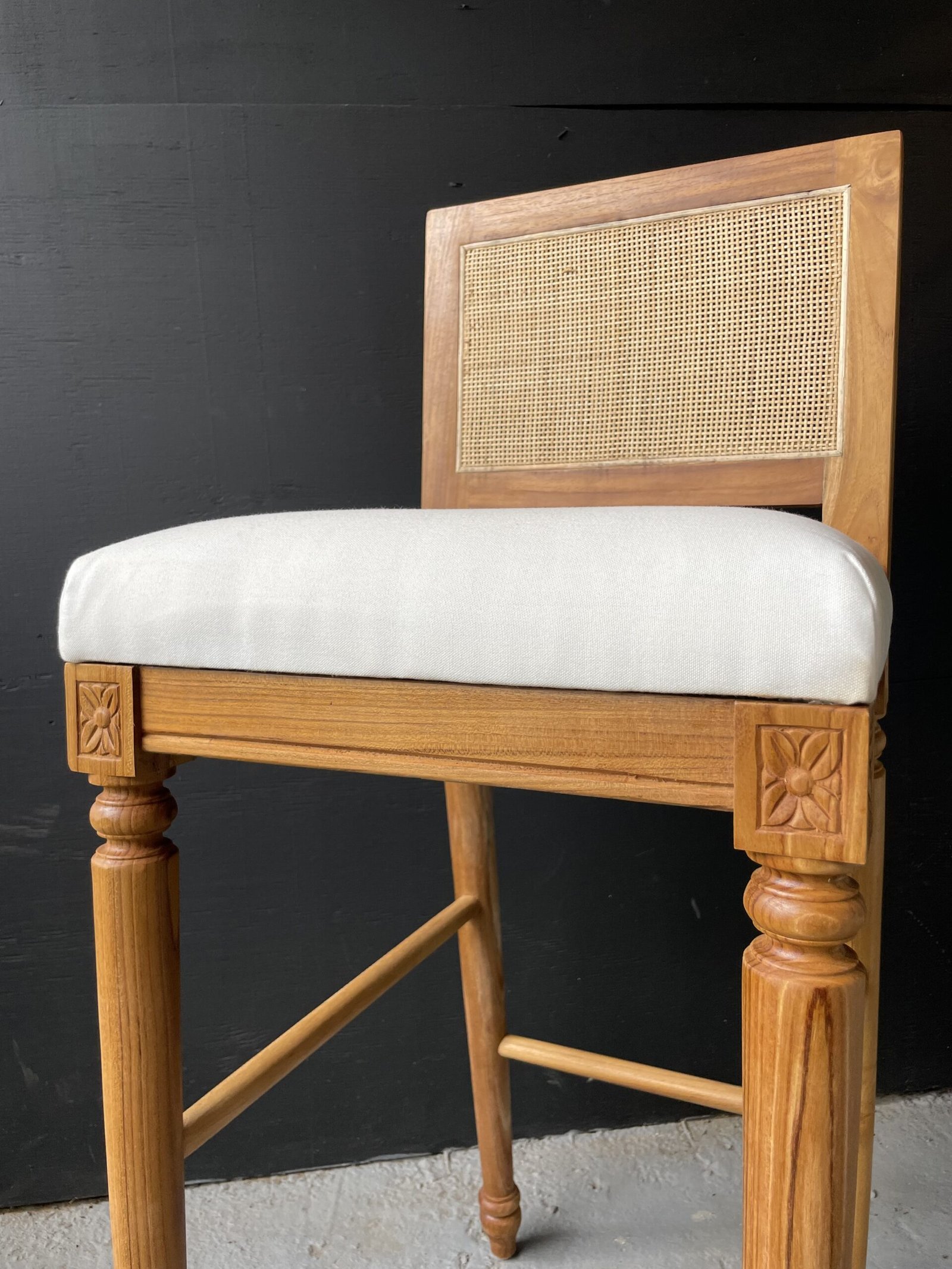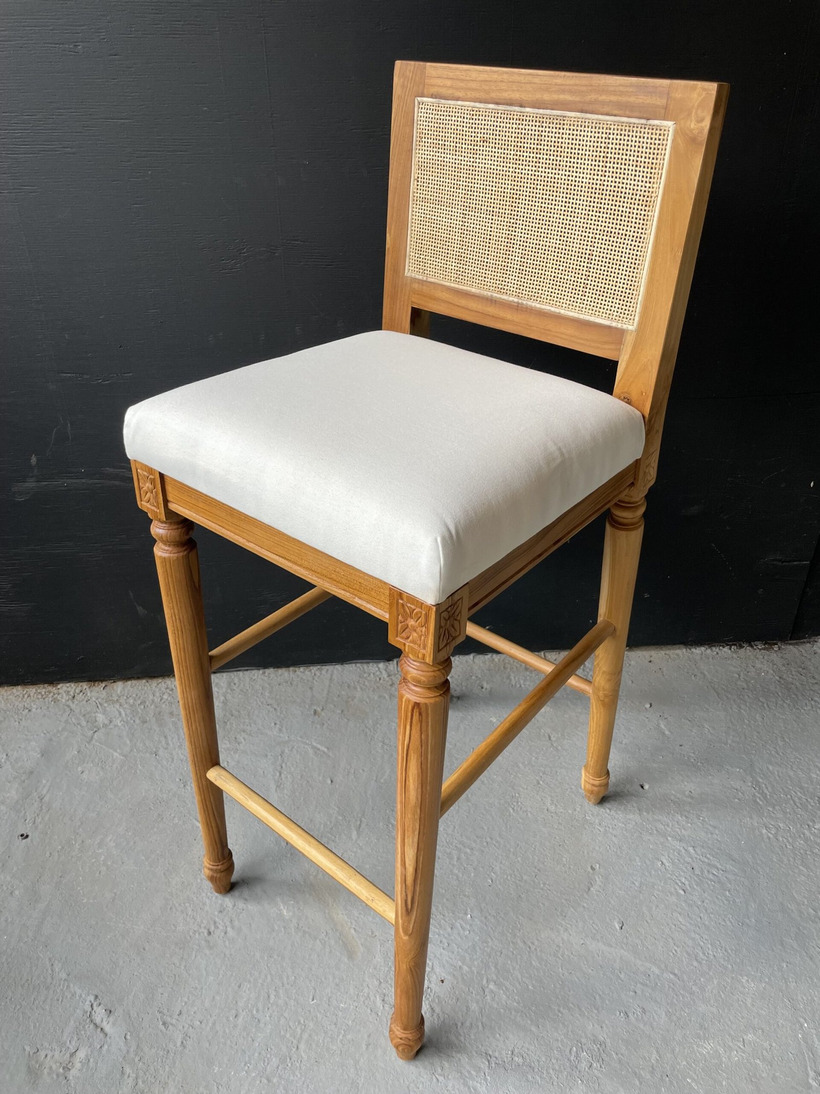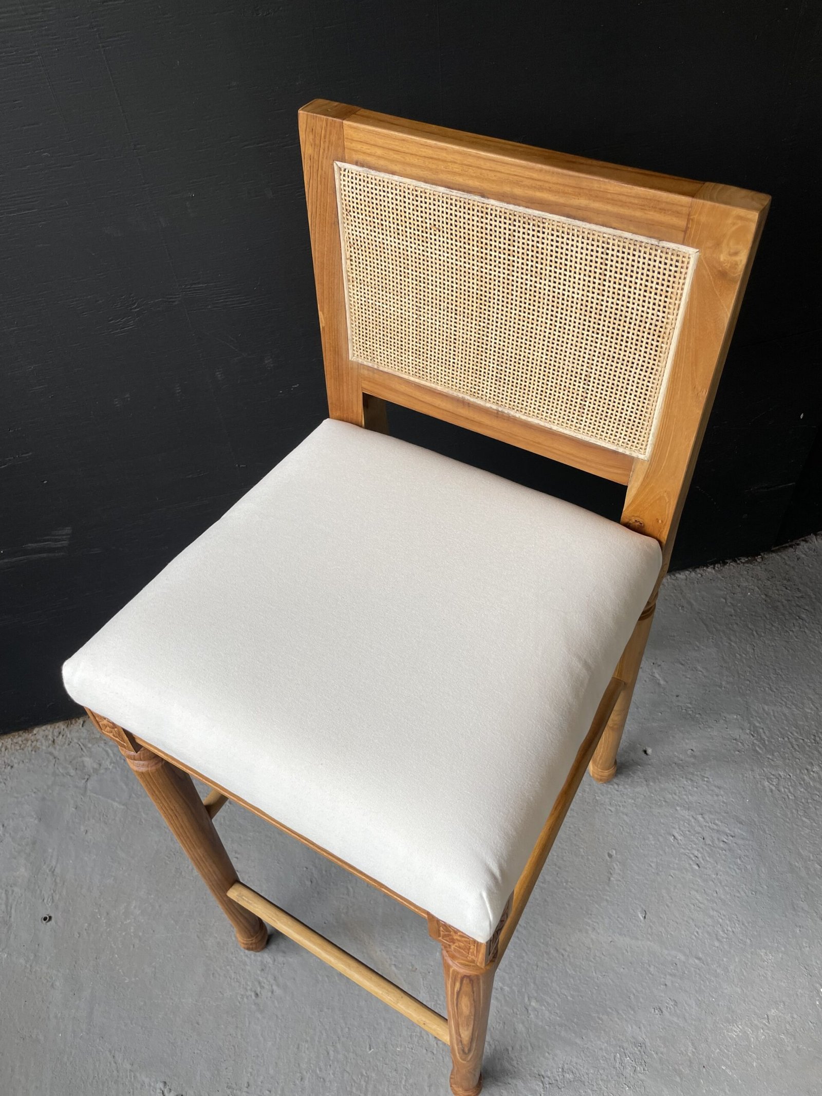 Banqueta hecha en teca con ratán y tela.